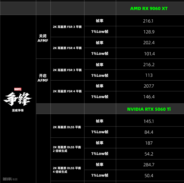 而这最后一款游戏 《漫威争锋》 就比较有意思了,哪怕只开一个 FSR 3 ,9060 XT 的平均帧率和 1% Low 帧也明显高于 5060 Ti ,没想到 《漫威争锋》 还是个 A 吹游戏。。。