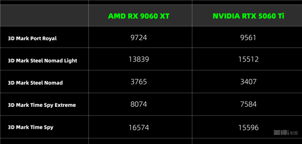 接下来我们直接开始跑分环节,首先是经典 3D Mark 连招,结果 9060 XT 上来就开始疯狂输出,5 个跑分项目有 4 个都比 5060Ti 高。。。