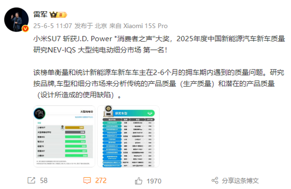 快科技6月5日消息,今日上午,小米汽车宣布,小米SU7荣获J.D.Power“消费者之声”大奖,位列2025年度中国新能源汽车新车质量研究(NEV-IQS)大型纯电动细分市场第一名。