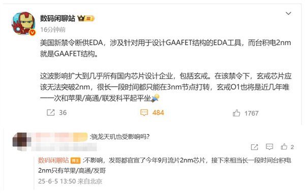 他指出,在该禁令下,玄戒芯片应该无法突破2nm,很长一段时间都只能在3nm节点打转,玄戒O1也将是近几年唯一一次和苹果/高通/联发科平起平坐的芯片。
