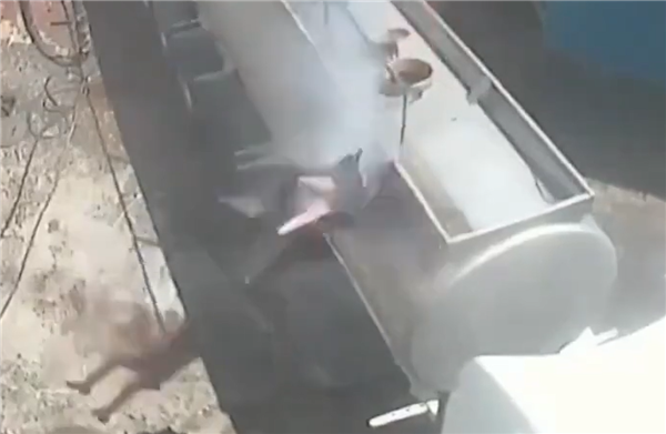 监控视频显示,男子打开罐盖后探头向里边看去,不料罐内积聚的油气被他嘴里的香烟给引燃,并发生剧烈爆炸,气浪将男子掀飞并重重摔到车下。