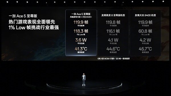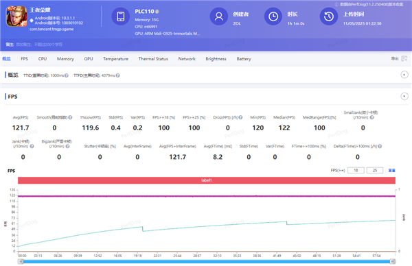 热门MOBA手游《王者荣耀》同样做到了游刃有余,实测连续1 小时游戏,平均帧率达121.7,1%Low 帧为119.6,帧率曲线近乎直线,这对于MOBA类游戏来说至关重要,1%的瞬间失误,足以毁掉99%的流畅体验。这也正是一加 Ace 5 至尊版死磕1%Low帧的意义:让每一次操作响应都精准跟手,让每一场战斗都没有意外。
