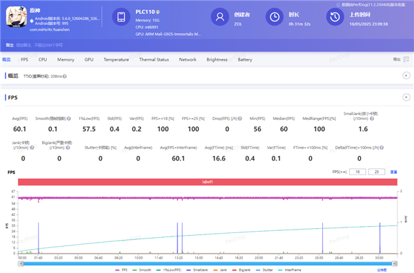 直接来看测试数据,在一小时《原神》测试中,一加 Ace 5 至尊版不仅平均帧率达到了60.1满帧,1%Low 帧达到57.5,与平均帧率差距微乎其微。这意味着全程没有出现卡顿问题,带来了连贯沉浸的游戏体验。