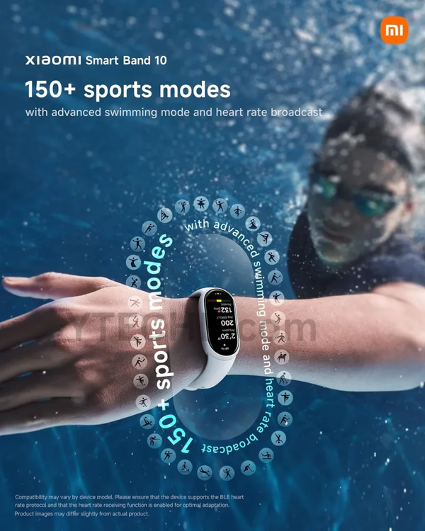 手环还内置150+种运动模式,涵盖进阶游泳模式(支持50米深度水下使用)和实时心率播报功能。
