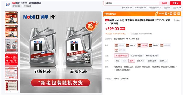 京东自营,银美孚 1 号机油 4L + 机滤 + 工时日常售价 399 元,今日 618 大促付 10 元定金后可抵 180 元。