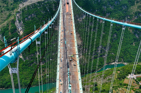 作为贵州六安高速公路的控制性工程,花江峡谷大桥全长2890米,桥墩最大高度262米,主桥跨径1420米,于2022年1月正式开工。这座钢桁梁悬索桥建成后,将以桥面距江面625米的高度成为新的世界第一高桥。目前,大桥主桥下构、引桥、索鞍、主缆系统、钢桁梁等核心工程已全部完工,施工人员正全力推进护栏安装、桥面铺装及观光电梯等收尾工作。