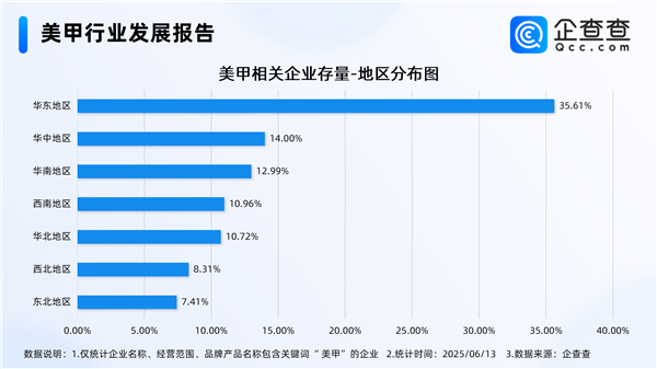 从地区分布情况来看,华东地区在美甲行业中占据着领先地位,现存美甲相关企业数量最多,占比高达 35.61%。