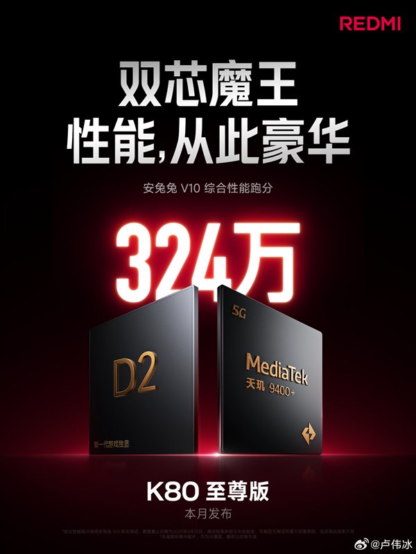 核心配置上,REDMI K80至尊版采用1.5K直屏,搭载联发科天玑9400+旗舰平台,内置狂暴引擎4.0,安兔兔跑分突破324万,刷新了天玑平台新纪录,同时支持超声波屏幕指纹,电池容量是7410毫安时,支持100W有线闪充。
