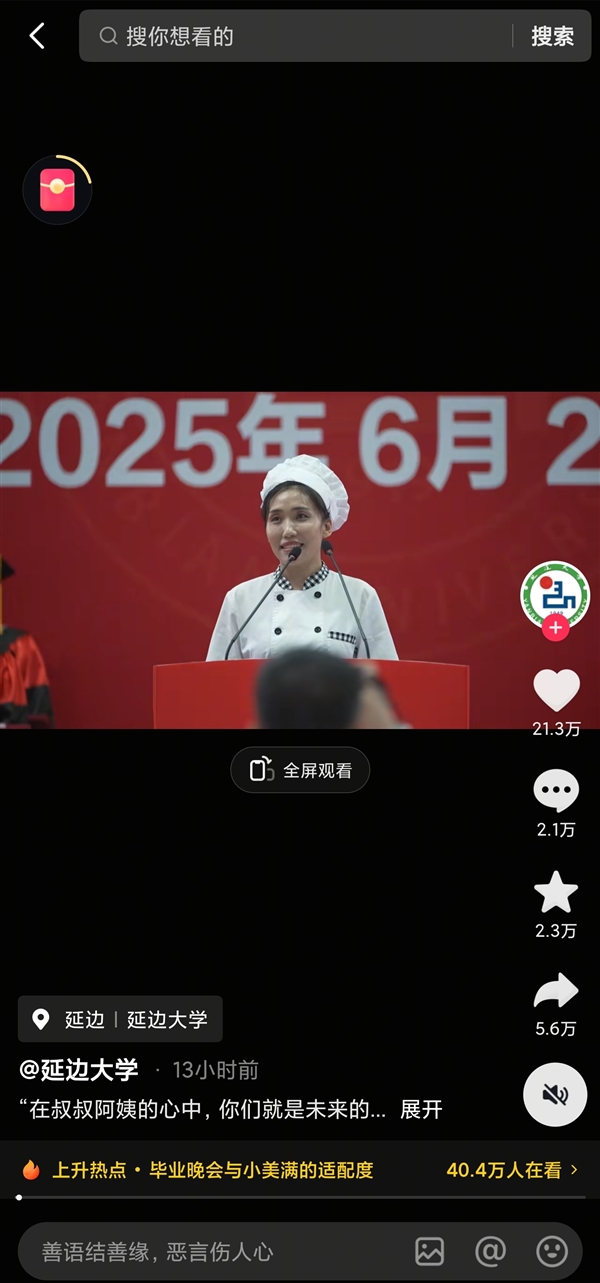 6月21日消息,据媒体报道,在延边大学2025届毕业典礼上,一位学校食堂阿姨的演讲引发关注。