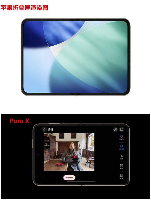 他还绘制了苹果折叠屏的渲染图,其造型很像华为今年上市的Pura X,后者是一款阔折叠机型。