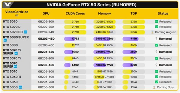 RTX 5080 Super采用了GB203-450内核,CUDA核心数量保持在了10752个,同样是显存从RTX 5080的16GB升级到了24GB,依旧是256bit的显存位宽,功耗从360W增加至415W,增加了15.3%。