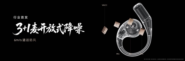 业界首发的3Mic+骨传导开放式混合降噪系统,创新双低音算法革新,融合动态低音补偿+瞬态增强,号称能带来入耳式耳机的音质体验。