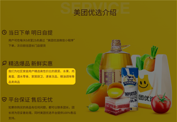 美团优选于 2020 年 7 月成立,属于社区团购,但跟咱们常用的那种有点区别,它的模式是今天在小程序上预购好,次日你去团长的站点自提。
