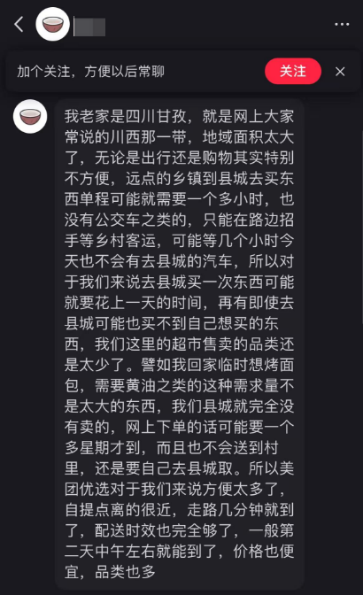 一位来自四川甘孜的网友告诉差评君,在他老家,想要线下买东西,得去到县城里的超市,可能要花上一天时间,超市里的物资还少。线上买东西,下单后要一个多星期才到,而且也需要去县城自取。