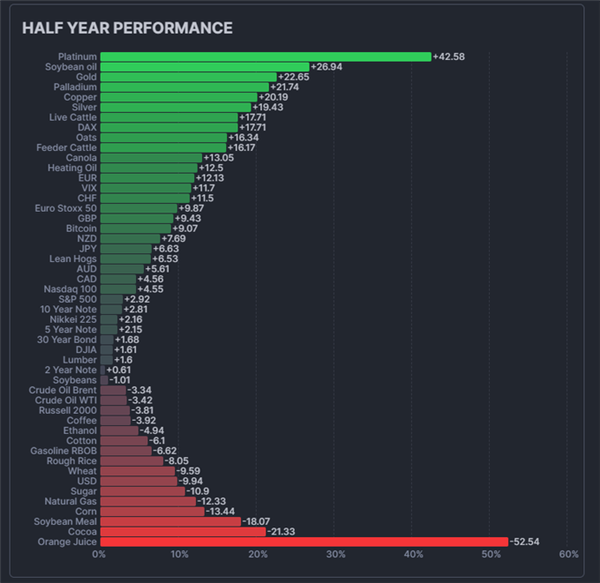 如下图所示,铂金价格在今年上半年累计上涨了逾40%,领涨了全球主要的跨资产类别。