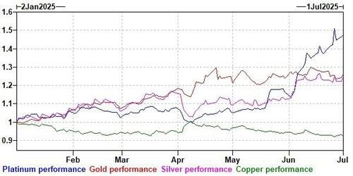 仅在6月份,由于对冲基金和投机性交易商涌入,铂金价格跃升了28%,创下了自1986年以来最强的月度表现,并一度触及了每盎司1432.6美元的11年高位。