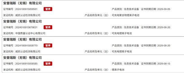 作为专业研发生产消费类锂离子电池的公司,安普瑞斯是国内充电宝领域软包电池的第一大供应商。PConline在国家市场监管总局查询发现,目前安普瑞斯的71个3C证书均为暂停/撤销状态,涉及产品均为锂离子电池、电芯等。