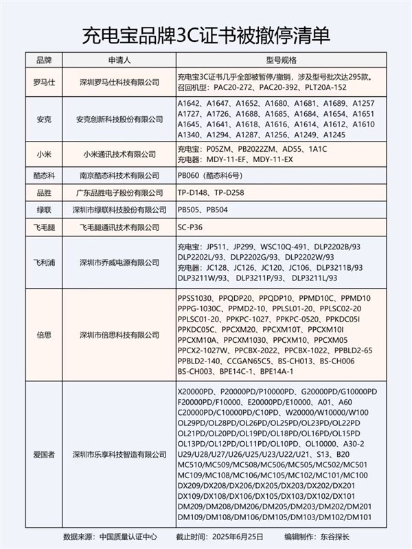 更别提,要不是罗马仕、安克这次“暴雷”,大多数用户甚至难以关注到早在事件发生半月前,已经有多批充电宝产品的3C认证均被暂停甚至撤销。