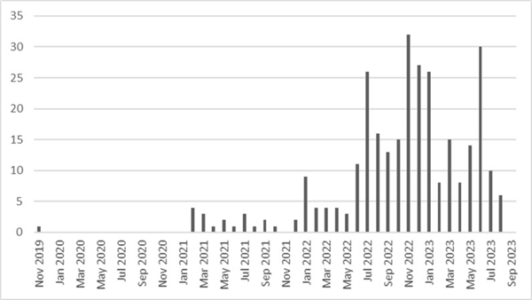 “...在B站上, 相关视频发布于2019年11月...与外国伪史相关的视频数量在2021年开始上升,并在2022年达到流行高峰。”