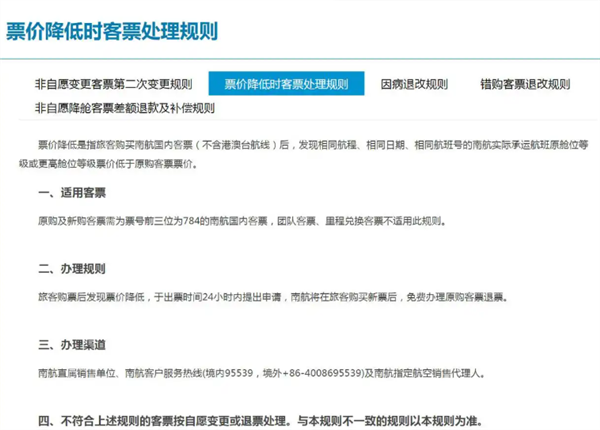 南航客服也表示,确实有票价降低时客票处理规则。