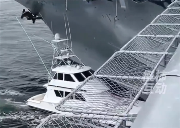码头的监控画面显示,事故发生在白天,这架游艇直冲冲怼到了航母上,不过,因为游艇的速度不快,且吨位较轻,撞到了航母后,游艇直接被推到一旁。