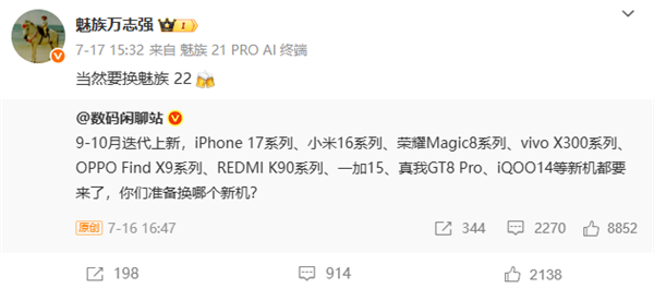 数码博主“数码闲聊站”近日发文预告了9-10月将发布的新机,万志强转发微博并评论:“当然要换魅族22”。