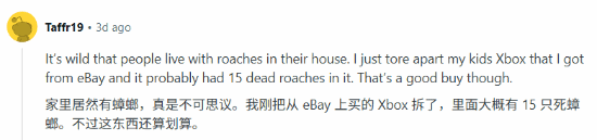 网友在评论区也分享自己购买二手Xbox的经历,虽然划算,但是里面有多达15只蟑螂。真是够恶心的,提醒玩家到手一定要注意清理。