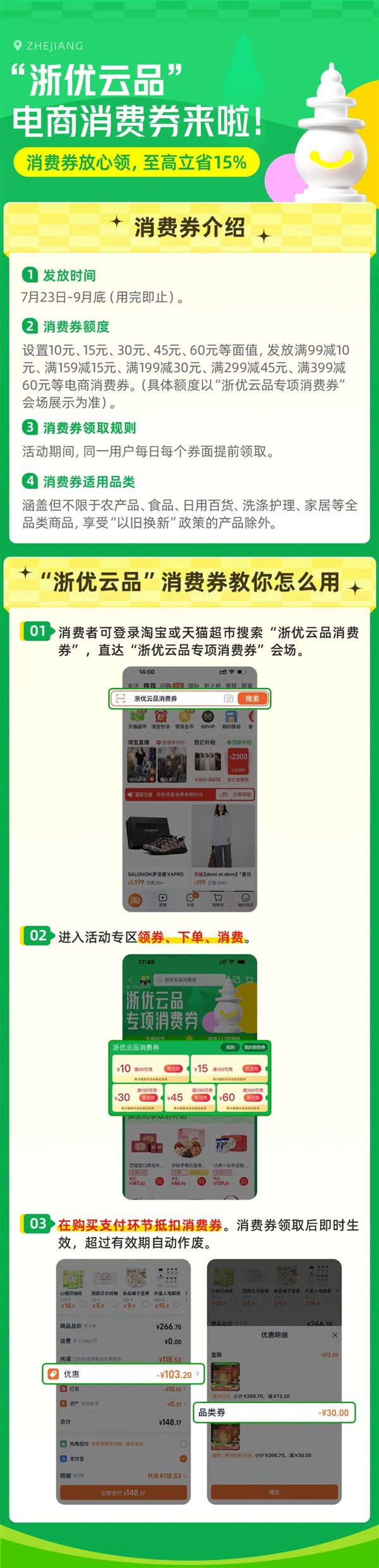 -消费者可登录淘宝或天猫超市搜索“浙优云品消费券”,直达“浙优云品专项消费券”会场。