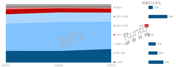 0-499元和1000-1499元区间的产品市场跟随其后,成为第二和第三销量仓。