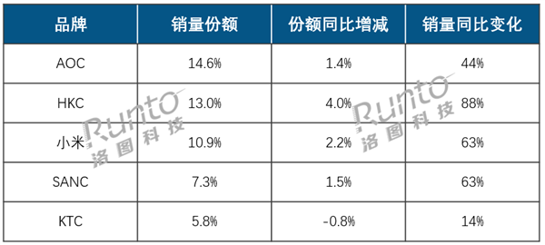 AOC、HKC与小米稳居销量及销额榜的前三甲。