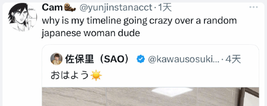 这两天霓虹女生SAO的“可爱上班照”突然在英语推特被疯转,时间线上铺天盖地全是她的照片。