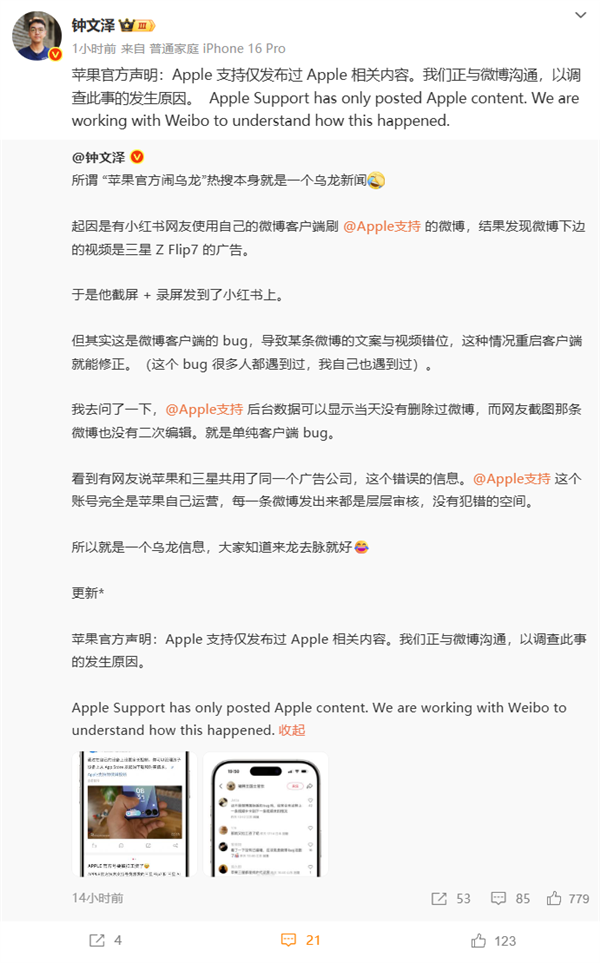 事情起因是有网友在社交平台发帖,称Apple支持官方发布的微博,正文与视频内容不符。