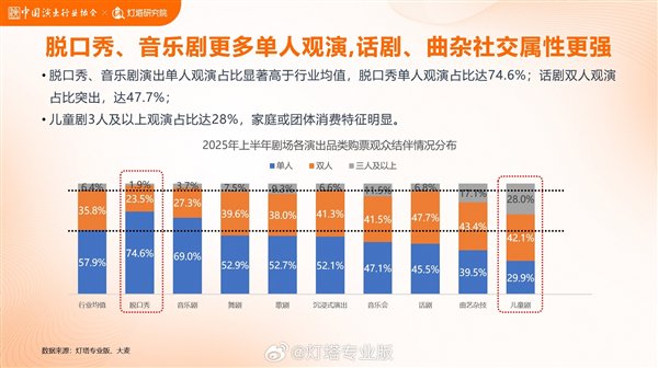 专业剧场巡演场次激增,带动票房同比涨134.9%,单人观演占比74.6%,贴合年轻群体消费习惯,让脱口秀从综艺“衍生”成独立演出品类。