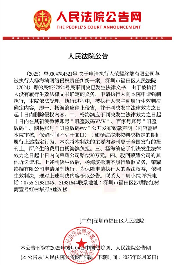 公告显示,关于申请执行人荣耀终端有限公司与被执行人杨XX网络侵权责任纠纷一案,深圳市福田区人民法院(2024)粤03民终27894号民事判决已发生法律文书,由于被执行人没有履行生效法律文书确定的义务,申请执行人向本院申请强制执行,本院依法受理。