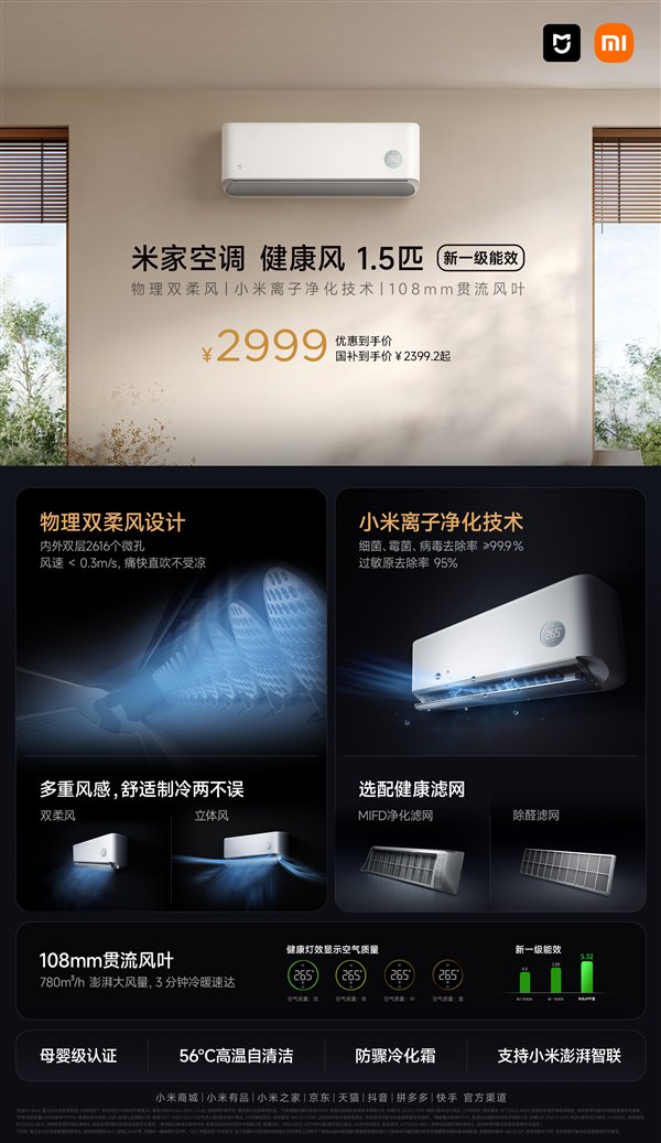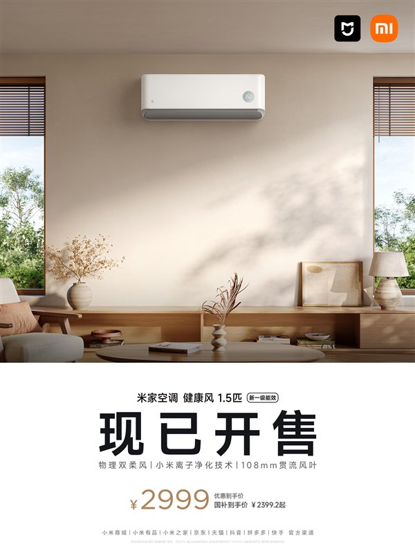 快科技8月5日消息,小米最新推出的米家空调健康风1.5匹今晚正式开售,官方定价是2999元,国补到手价是2399.2元。