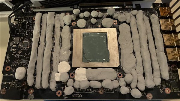 此外他还对显卡进行了重新涂胶,使用了PTM 7950和Upsiren UX Ultra导热胶,这些材料比默认的导热胶更有效。