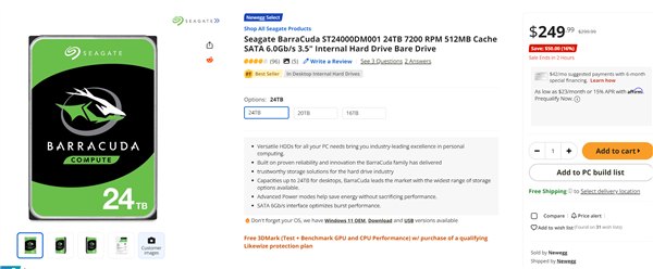在美蛋上,希捷24 TB BarraCud硬盘只要249.99美元,比之前便宜了50美元,降价16%之多。