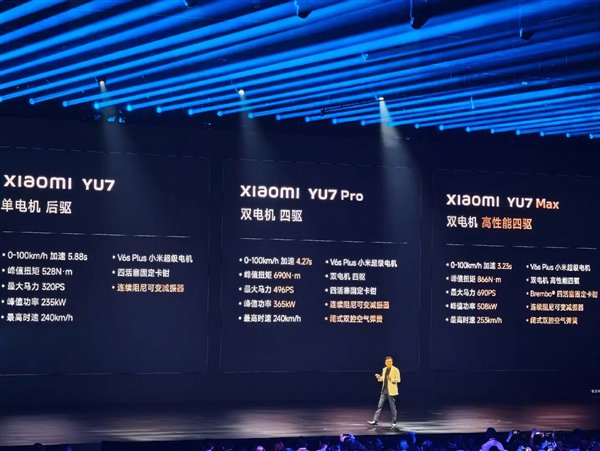 据悉,小米YU7标准版是单电机后驱,而YU7 Pro和YU7 Max都是双电机四驱,Max版是双电机高性能四驱。