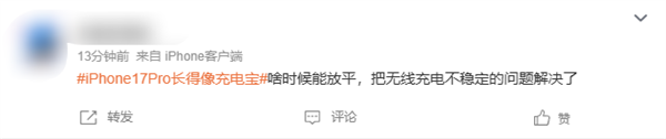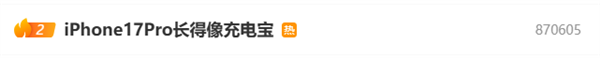 今日,词条#iPhone17Pro长得像充电宝#冲上微博热搜榜,引发网友热议。