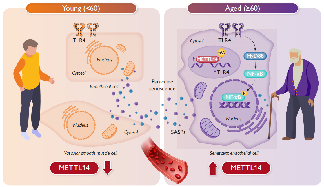 这是研究人员在机制上首次阐明METTL14通过促进Toll样受体4(TLR4)mRNA的m6A修饰增强其稳定性,介导衰老相关分泌表型的生成。临床研究发现,人血液中METTL14和TLR4水平升高与血管衰老及动脉粥样硬化和动脉硬化的发生呈正相关。