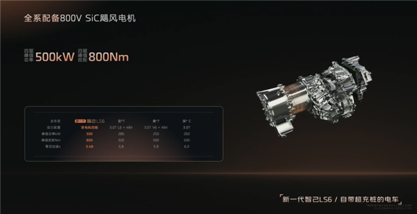 全系配备了800V SiC飓风电机,四驱版系统最大功率500千瓦,峰值扭矩800牛米,零百加速3.48秒,后驱版为6.4秒。