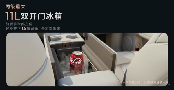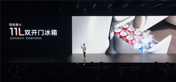 细节部分,中控台提供了悬浮音响单元,中控屏下方保留有部分实体按键,同时还设置了双无线充电面板、双杯架,T型台下方则做了掏空处理,可拓展储物空间,并提供11升双开门车载冰箱和电动遮阳帘。