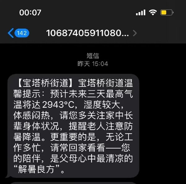 快科技8月19日消息,近日,南京宝塔桥街道的网友接收到一条离谱的高温提醒。