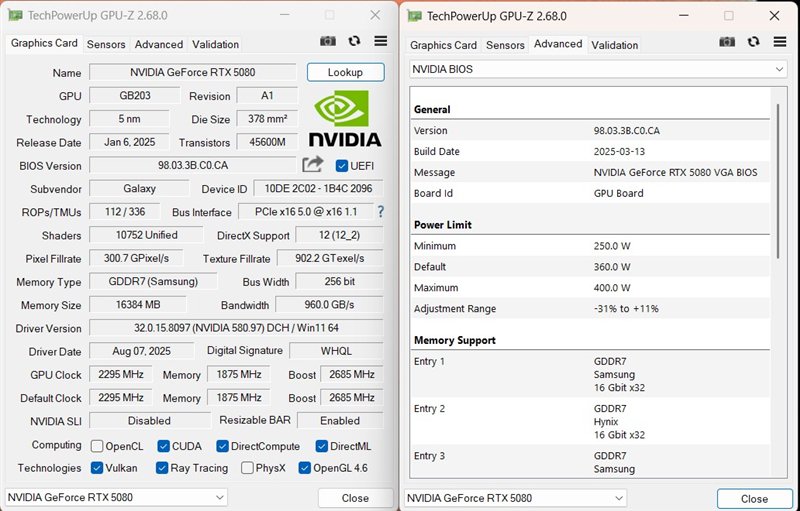 从GPU-Z的截图中可以看出,RTX 5080星曜NOX OC的加速频率比公版高了68MHz,TDP同样都是360W,但可以通过超频软件拉到400W。