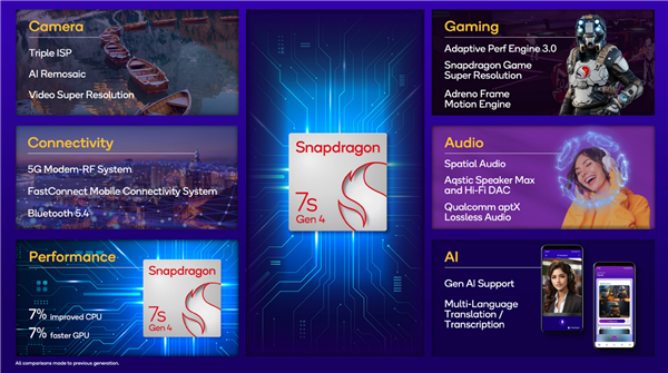 与前代相比,第四代骁龙7s的CPU性能提升7%、GPU图形渲染速度提升7%,可以看作是第三代骁龙7s的超频版。