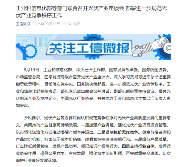 此前一日(8月19日晚),“工信微报”官微突发消息称,工业和信息化部、中央社会工作部、国家发展改革委、国务院国资委、市场监管总局、国家能源局当日联合召开光伏产业座谈会,进一步规范光伏产业竞争秩序。