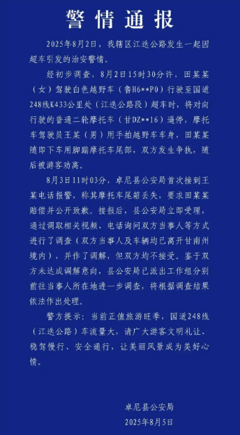 经初步调查,8月2日15时30分许,田某某(女)驾驶白色越野车(鲁H6**P0)行驶至国道248线K433公里处(江迭公路段)超车时,将对向行驶的普通二轮摩托车(甘DZ**16)逼停,摩托车驾驶员王某(男)用手拍越野车车身,田某某随即下车用脚踹摩托车尾部,双方发生争执,随后被游客劝离。