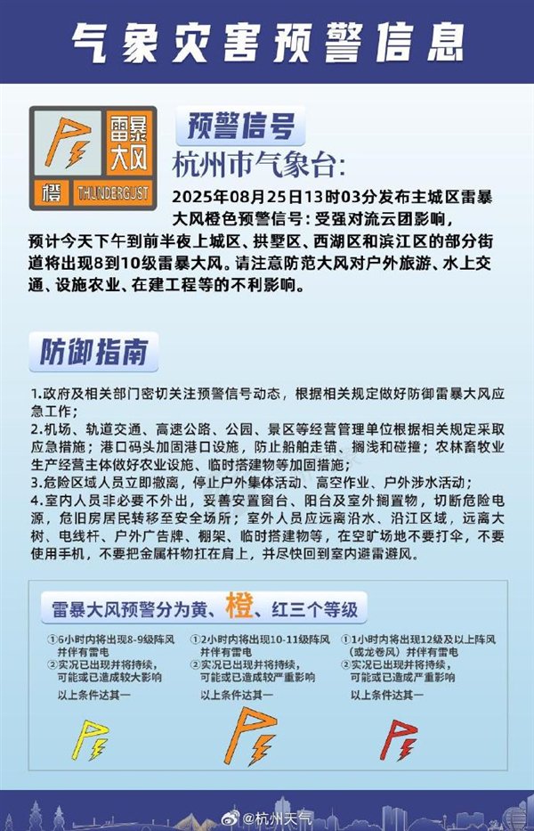 杭州市气象台2025年08月25日13时00分发布主城区雷电黄色预警信号:受对流云团影响,预计今天西湖区、拱墅区、上城区和滨江区的部分街道将出现雷电天气。雷雨时局部伴有短时大到暴雨和7-9级个别10级以上雷雨大风。