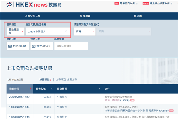 8月25日,在港交所披露易中,“现有上市证券”类型中已经无法搜索中国恒大(03333.HK),该公司正式被列入“已除牌证券”。这意味着,中国恒大从今日起正式宣告退市。