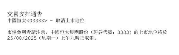 8月20日,港交所宣布,自2025年8月25日上午9时起,中国恒大的上市地位将根据《上市规则》第6.01A(1)条予以取消。